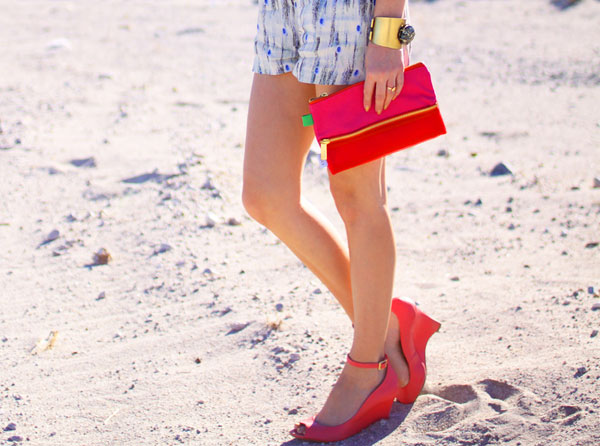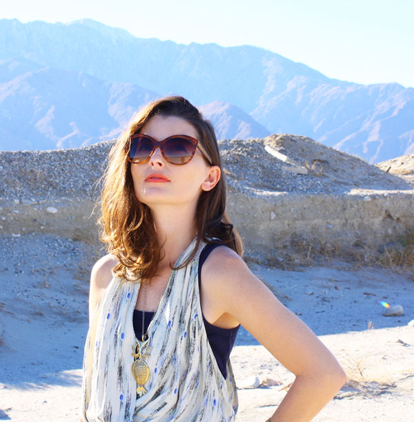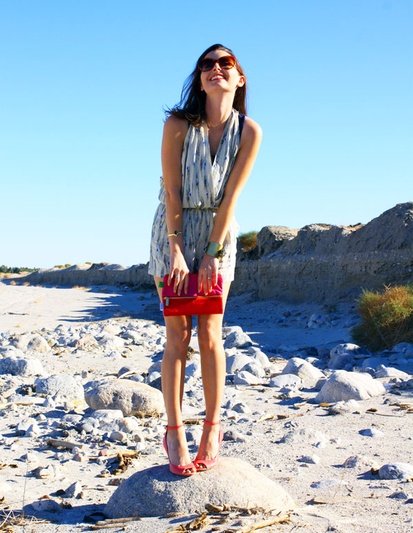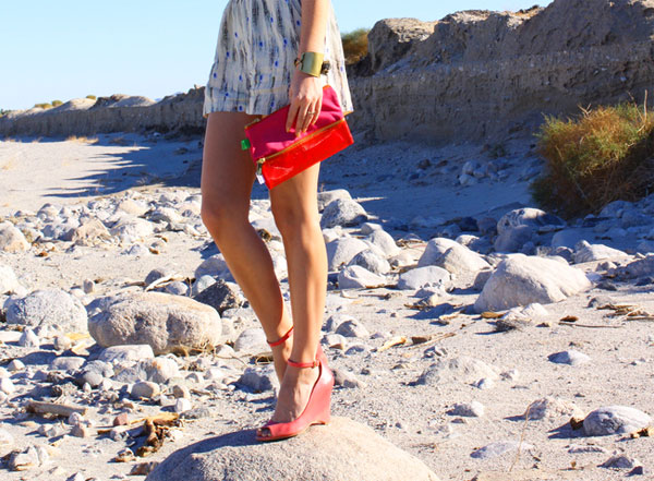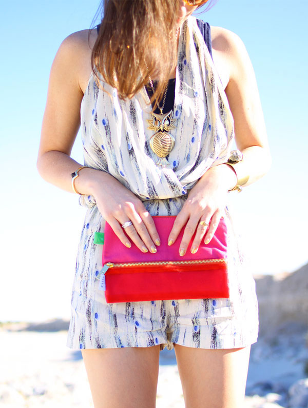Some sparkly arm candy, a sweet vintage owl necklace, along with bubblegum pink wedges, a swipe of coral on my lips, some retro-flair shades, and this colorblock bag I picked up in Melbourne, and I was ready for desert adventures.