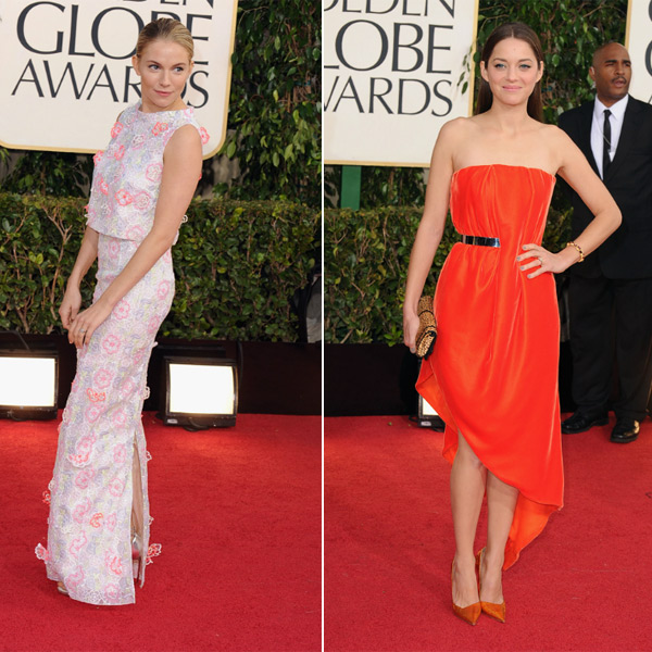 Truth be told, when I first spotted Sienna Miller on the red carpet, I thought What is she wearing?! And put some lipstick on. But the 60s-inspired look by Erdem and fresh-faced makeup kept growing on me and now seem quite refreshing. Do you agree? And while Marion Cotillard’s sunset Dior isn’t a total showstopper on its own, that modern gold belt and the fact that it’s on the stunning Marion Cotillard makes it a winning look in my book.